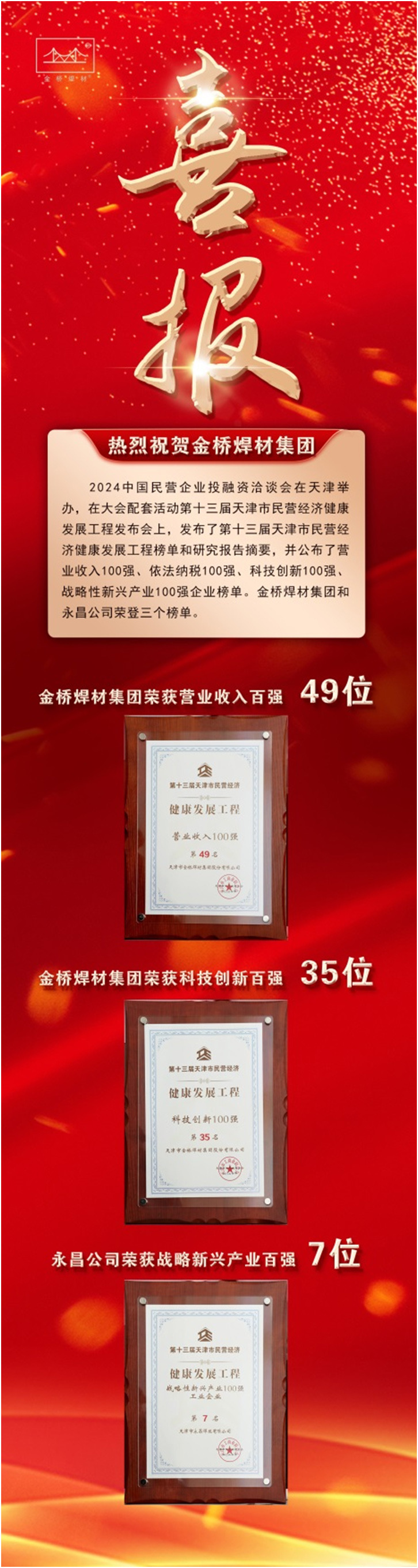 金橋焊材集團入選第十三屆天津市民營經濟健康發展工程多個榜單